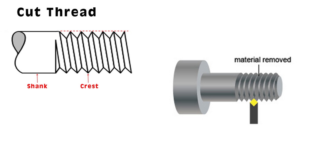 A type of thread in which the crest of the thread is at the same level as the bolt (or screw) shank. And made with a Metal lathe cut machine or tools by removing the material.