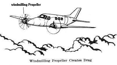An aircraft engine is said to be windmilling when it is turned by aerodynamic action of air flowing over the propeller or through the compressor in a gas turbine engine. If an engine fails in flight, air flowing over the propeller or through the compressor produces enough force to keep the engine turning. When a propeller windmills, it produces so much drag it can cause difficulty in controlling the airplane. For this reason, the propellers of most multiengine airplanes are made so that they can be feathered by turning the blades parallel to the direction of flight. When a propeller is feathered, it does not windmill.
