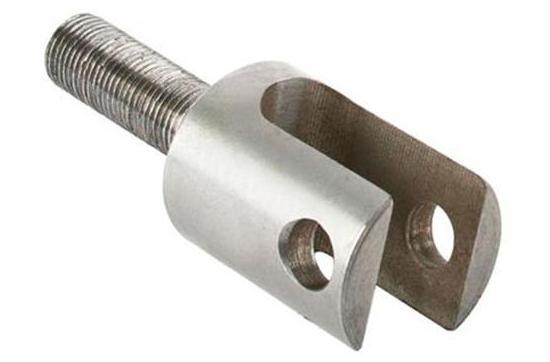 A u-shaped fitting which has matching holes in the arms of the u. a clevis pin or clevis bolt is passed through the holes to fasten a control cable to a control horn or to fasten a push-pull rod to a bell crank.