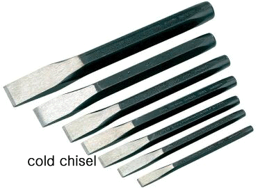 A metal-cutting tool made by grinding a sharp edge onto a flattened portion of a hardened steel rod. a cold chisel is used to cut metal when the metal is cold.