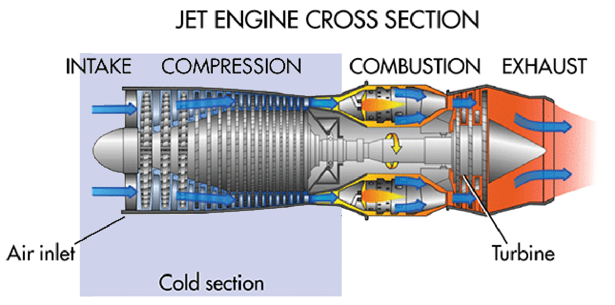 The portion of a gas turbine engine ahead of the combustion section. the cold section includes the inlet duct or ducts, compressor, and diffuser.