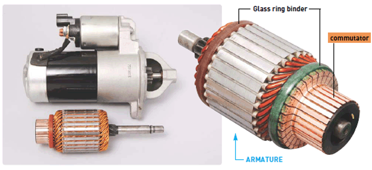 کوموتاتور ، محور مسی متصل به آرمیچر مولد برق. کار این محور یکسو کردن جریان برق مولد یا موتور می باشد