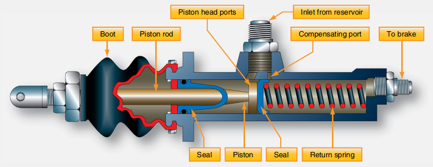 A compensating port connects the reservoir to the cylinder, ahead of the primary cup. With the brakes off, this port connects the brake system with the reservoir. It compensate for changes in volume of the fluid due to heat or wear. The rod from the brake pedal pushes on the piston.