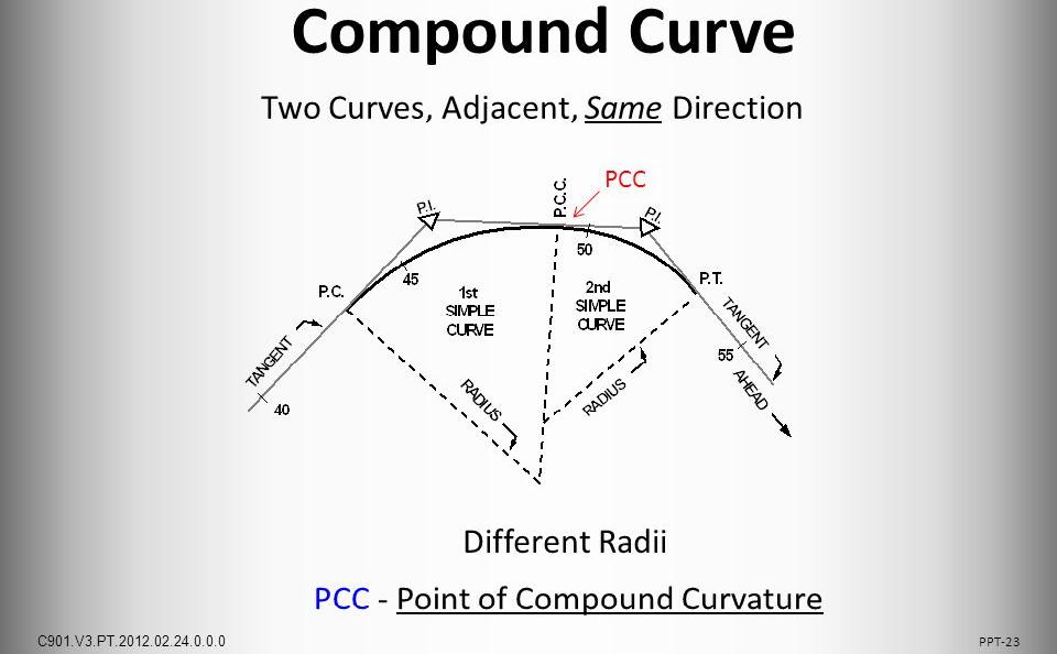 A curve formed in more than one plane. the surface of a sphere is a compound curve.