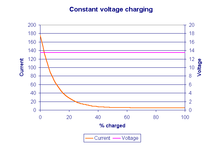 A method of charging aircraft batteries in which a constant voltage is placed across the battery while it is being charged. When a battery is discharged, its voltage is low and the charging current is high. But as the battery becomes charged, its voltage rises and the charging current decreases. When the battery voltage is the same as the voltage of the charging source, no more charging current flows. Aircraft generators charge the batteries with a constant-voltage charge.