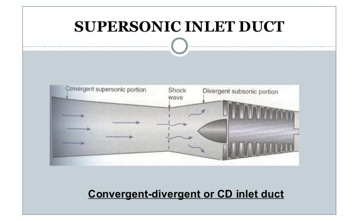 A form of duct, or passage, used for the inlet air to supersonic airplane engines. The forward section of the duct is convergent (it becomes smaller in the direction of the airflow). The air entering the duct at a supersonic speed is slowed to a speed of Mach one by a shock wave in the narrowest part of the duct. Beyond this point, the area of the duct increases-becomes divergent. The air, now traveling slower than the speed of sound, is further slowed, and its pressure increases.