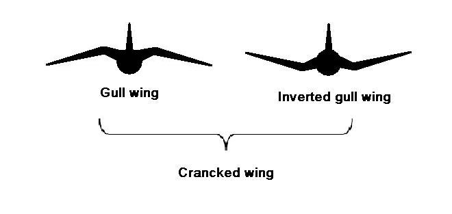A wing with an acute anhedral ( or diheadral) inboard and an acute dihedral(or anhedral) outboard. The sudden transition from anhedral to dihedral takes place at the wing midspan.two types of cranked wing are existed : gull wing and inverted gull wing