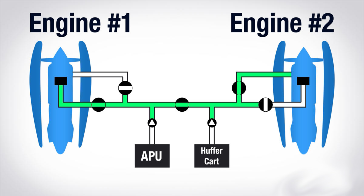 An air ducting system used in a multiengine turbojet airplane in which compressor bleed air from one engine can be directed to another engine where it can be used to operate its air starter.