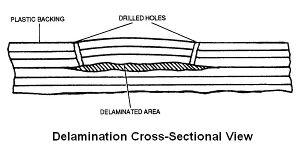 این عارضه روی سطوح کامپوزیتی بصورت برآمدگیِ سطح آشکار میگردد که گاهی حتی بصورت چشمی قابل تشخیص نیست و باید با استفاده از روش Tap Test یعنی با ضربه زدن آرام بوسیله یک چکش پلاستیکی کوچک تشخیص داده شود. اصطلاحاً سطوحی که دچار دلامینیشن شده اند صدای پوکی می دهند.