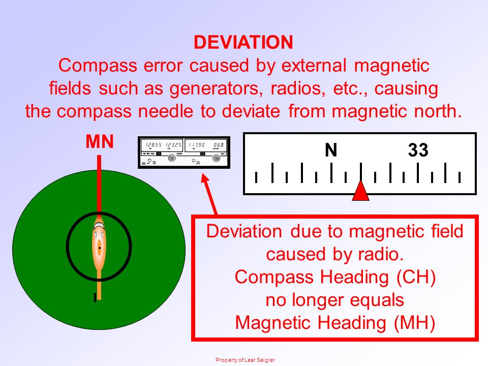 انحراف، خطا، منحرف شدن قطب نمای هواپیما به طرف میدانهای مغناطیسی موجود در هواپیما
