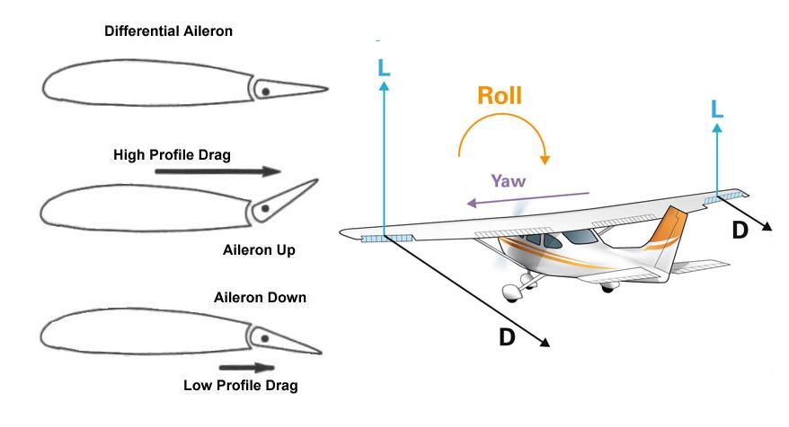 اختلاف در مقدار حرکت ایلِرونها (شهپرها) روی بال ها بصورتیکه زاویه حرکت رو به بالا بیشتر از زاویه حرکت به سمت پایین است برای خنثی کردن انحرافات ناخواسته هواپیما (adverse yaw).