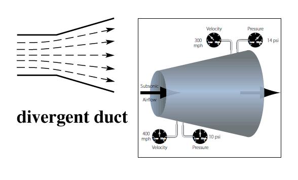 مجرای واگرا ، کانالی مخروطی با دهانه ورودی تنگ و خروجی گشاد که نتیجتاً سرعت هوای خروجی از آن کم و فشار زیاد میشود.