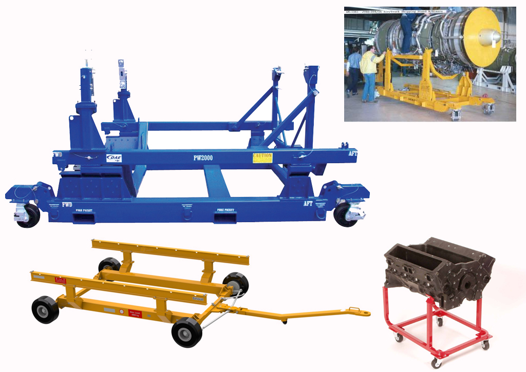 Any of several types of wheeled platforms used in a maintenance shop to move or store heavy aircraft or engine components.