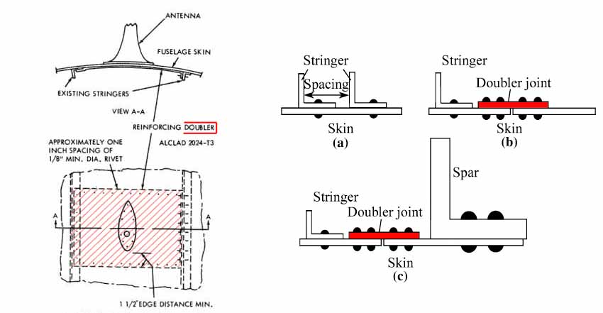 A piece of sheet metal used to strengthen and stiffen an aircraft skin at the location some component is to be attached. A doubler is normally riveted to the inside of the aircraft skin where a radio antenna is mounted.