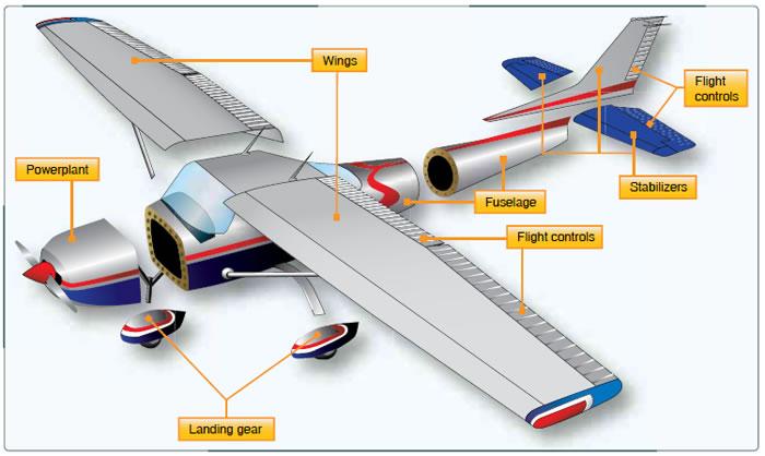 The fuselage, booms, nacelles, cowlings, fairings, airfoil surfaces (including rotors but excluding propellers and rotating airfoils of engines), and landing gear of an aircraft and their accessories and controls.