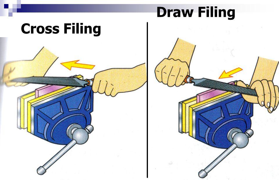A method of cutting metal or plastic with a hand file by moving the file crosswise over the work. Draw filing produces a very smooth finish.