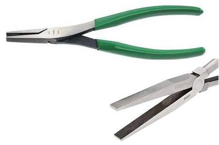 A special type of pliers used to twist safety wire. Duckbill pliers have long handles and wide, flat jaws with serrations to grip the wire, but they do not have jaws for cutting the wire.