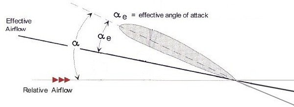 It is that part of a given angle of attack that lies between the chord of an airfoil and the effective airflow. Effective airflow is a line representing the resultant velocity of the disturbed airflow. Angular deflection of effective airflow is a function of vortex strength and TAS.