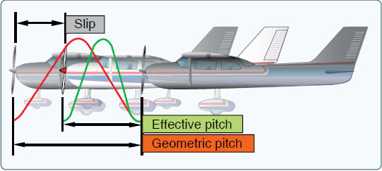 The actual distance a propeller moves through the air in one revolution. Effective pitch is the geometric pitch minus the slip.