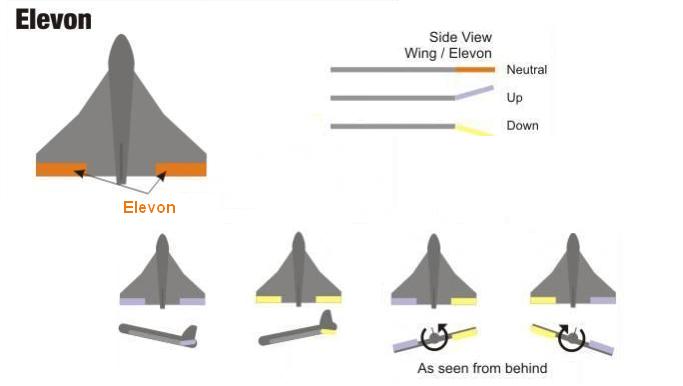 A combination elevator and aileron. Elevons are installed on the trailing edge of a delta wing or a flying wing airplane. Fore-and-aft movement of the control yoke causes the elevons to operate together. This causes the airplane to rotate about its lateral, or pitch, axis. Movement of the stick or control wheel to the right or left causes the elevons to move differentially. The left elevon moves up and the right elevon moves down. Differential movement of the elevons causes the airplane to rotate about its longitudinal, or roll, axis.