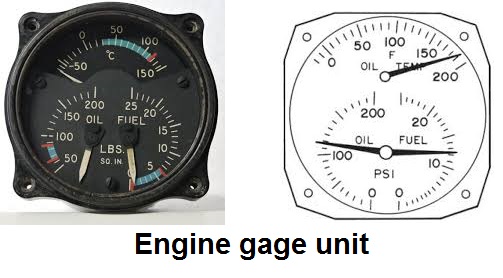 An indicator consisting of three indication sections in one case that shows the fuel pressure, oil pressure and oil temperature on a calibrated screen.