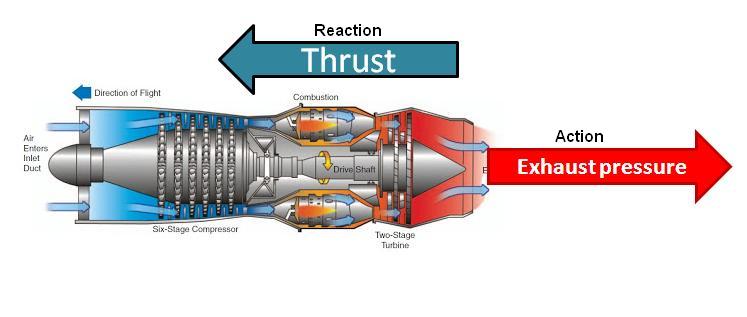 The reaction is caused by the rapid release of hot gases from the jet engine exhaust, which causes pushing the engine to the forward direction , and consequently the aircraft to move forward.