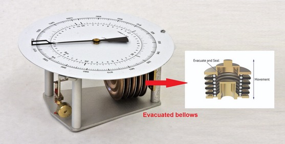 A set of bellows from which most of the air has been removed and the bellows sealed. They serve as the sensitive element in an aneroid barometer for measuring atmospheric pressure.