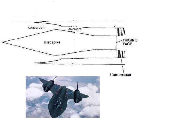 A sharp-pointed spike in the inlet air duct of a supersonic aircraft. This spike forms an oblique, or angled, shock wave inside the inlet duct as it passes through the air. Air entering the first-stage compressor of a gas turbine engine must flow at a speed below the speed of sound, and when the airplane is flying faster than sound, the air must be slowed before it enters the compressor. When air passes through the oblique shock wave, it slows down, but is still moving faster than the speed of sound. Just inside the inlet duct, a second shock wave, this time a normal shock wave, is produced. This normal shock wave is at right angles to the airflow, and air passing through it is slowed to a speed below the speed of sound.