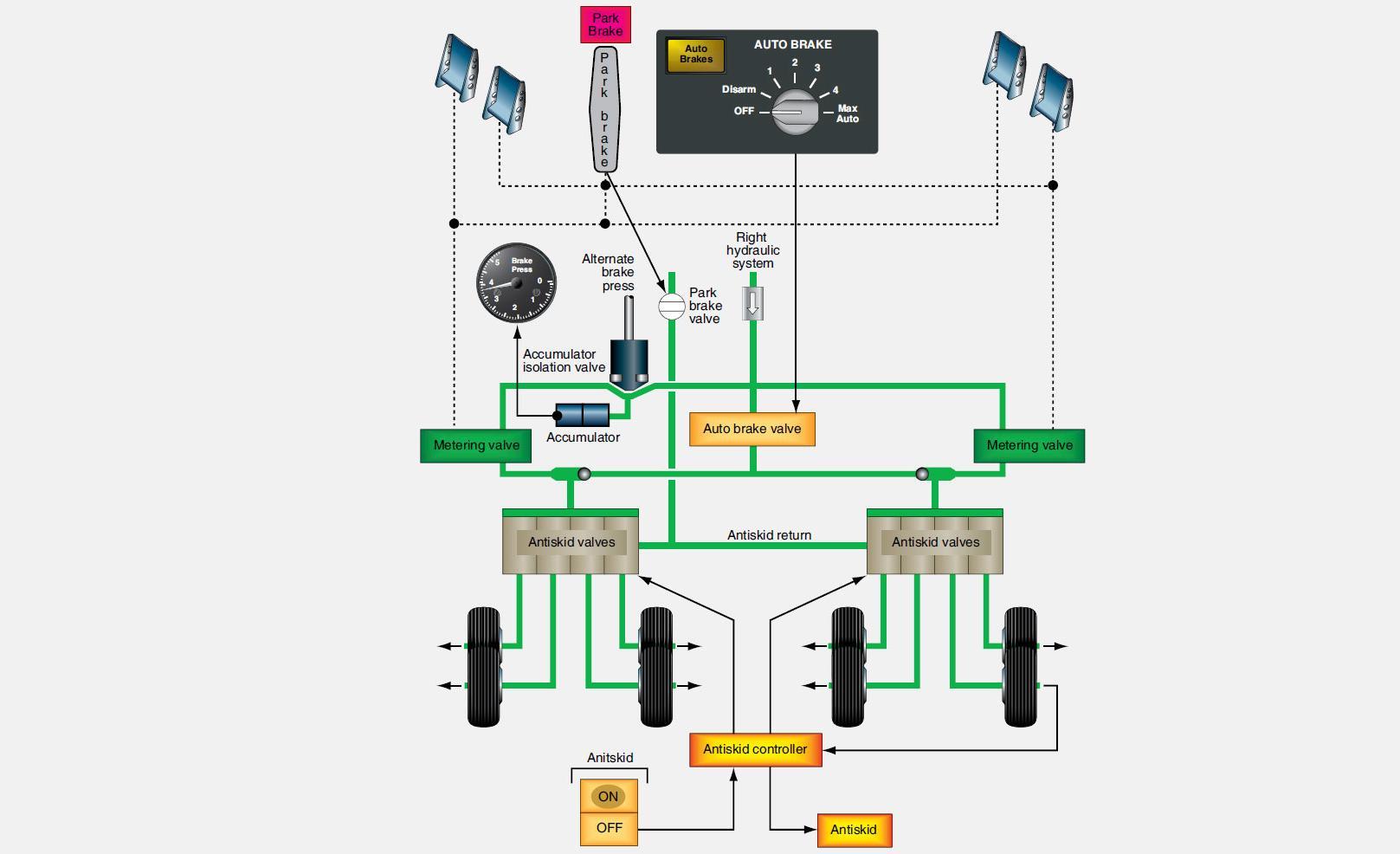 An electrohydraulic control in an airplane's power brake system that prevents the wheels skidding on wet or icy runways. A wheel-speed sensor monitors the deceleration rate of every main landing gear wheel. If any wheel decelerates too rapidly, indicating an impending skid, pressure to that brake is released and the wheel stops decelerating. Pressure is then reapplied at a slightly lower value.