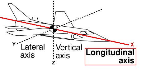 محور طولی ، محوری که دماغه را به دم هواپیما وصل می کند و در نقطه مرکز ثقل بر محورهای دیگر عمود است. دوران حول این محور بالهای هواپیما را بالا و پایین برده و عمل غلتش ( Roll ) را بوجود می آورد
