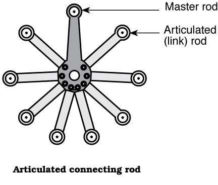 A link rod which connects the pistons in a radial engine to the master rod. there is one less articulated rod than there are cylinders in each row of cylinders in a radial engine.