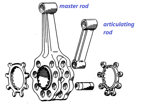 A link rod which connects the pistons in a radial engine to the master rod. there is one less articulated rod than there are cylinders in each row of cylinders in a radial engine.