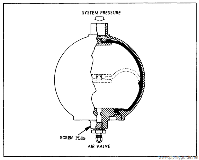A component in a hydraulic system that allows a noncompressible fluid, such as oil, to be stored under pressure. An accumulator has two compartments separated by a flexible or movable partition such as a diaphragm, bladder, or piston. One compartment contains compressed air or nitrogen, and the other is connected into the source of hydraulic pressure. When oil is pumped into the accumulator, the partition moves over and increases the pressure of the air. This air pushing against the partition holds pressure on the oil. An accumulator in an aircraft hydraulic system acts as a shock absorber and provides a source of additional hydraulic power when heavy demands are placed on the system.