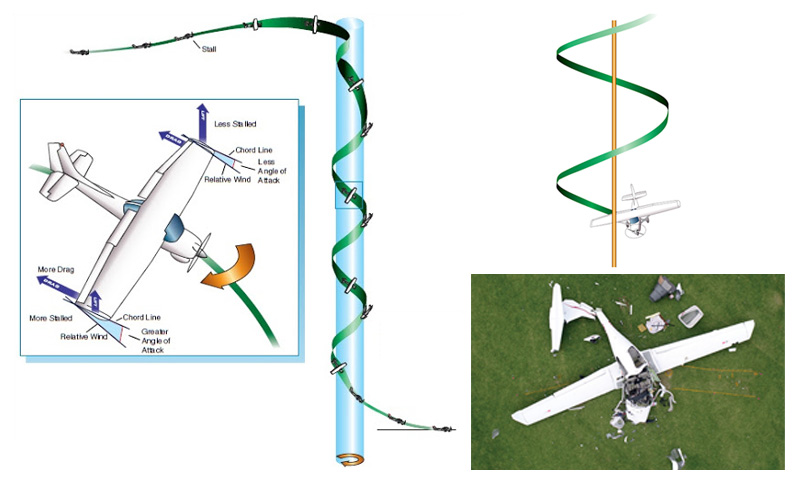 در این زمان هواپیما در وضعیتی نزدیک به استال قرار گرفته و خیلی زود شروع به چرخش حول محور عمودی می نماید و بالی که استال کرده بود به سمت عقب و بال دیگر به سمت جلو حرکت کرده و تولید لیفت بیشتری میکند ، دماغه هواپیما به سمت پایین متمایل شده وارتفاع آهسته شروع به کم شدن می کند و هواپیما در یک مسیر مارپیچی قرار میگیرد و چنانچه به موقع اقدامی صورت نپذیرد سرعت چرخش و کاهش ارتفاع رفته رفته افزایش می یابد.
