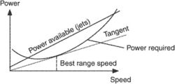 The speed that gives the maximum number of air miles for each unit by weight of fuel (if the wind is not considered). it is the speed at which the tangent from the origin meets the power-required curve.