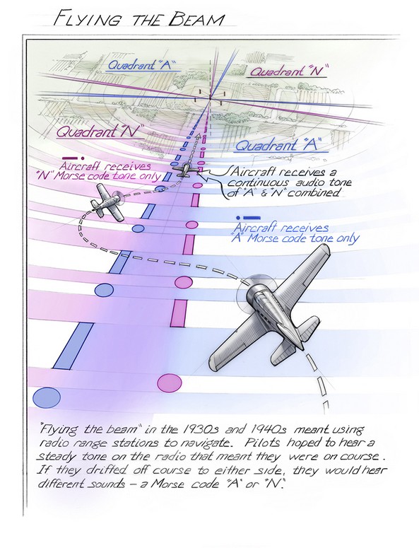 (radio Navigation):The beam is a descriptive term which refers to an invisible path produced by radio signals. An aircraft can follow the beam when going to or from a navigational fix. The term beam became popular with the four-course, low-frequency radio range that projected four clearly defined beams, or courses, from each of the transmitting stations. When a pilot was flying an aircraft along one of these courses, he was said to be on the beam.