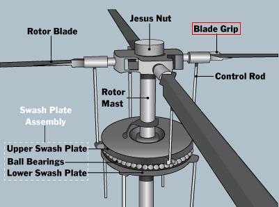 The portion of a helicopter rotor hub into which the blades fit. blade grips are sometimes called blade forks. the rotor blade is attached to the blade grip with a lead-lag hinge pin.