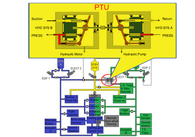 زمانيكه فشار سیستم هیدرولیک A بنا به هر دليلی افت پيدا كرده و يا صفر شود، موتور PTU توسط فشار سیستم هیدرولیک B چرخانده میشود و نیروی گشتاور این موتور از طريق يك شفت مشترك به آن سر دیگر PTU كه پمپ هیدرولیک است و در سيستم A قرار گرفته انتقال می یابد و باعث چرخیدن آن و توليد فشار هيدروليك می شود .