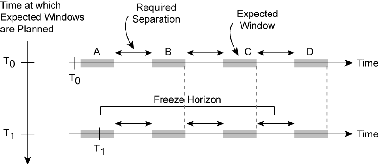 The time or point at which an aircraft's STA becomes fixed and no longer fluctuates with each radar update. This setting insures a constant time for each aircraft, necessary for the metering controller to plan his/her delay technique. This setting can be either in distance from the meter fix or a prescribed flying time to the meter fix.