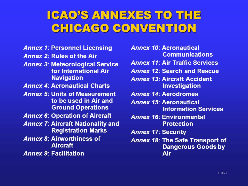 استانداردها و اقدامات توصیه شده توسط ICAO در هر حوزه کاری در 18 پیوست موجود است. هر پیوست به یک موضوع خاص مربوط می شود. همه موضوعها به صورت منظم و با ذکر جزئیات مربوط به آنها در این 18 پیوست موجود می باشد .