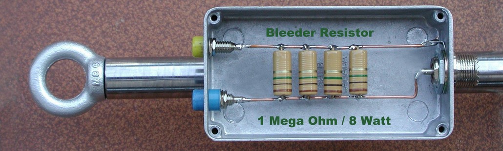 A high-resistance resistor placed between the output of an electrical power supply and ground. The function of a bleeder resistor is to draw a fixed current for improved regulation, or stabilization, and to bleed off high-voltage charges from the capacitors when the equipment is shut off.