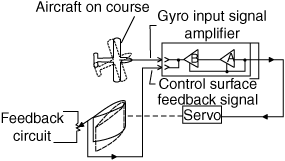 A type of automatic control system in which part of the output is fed back into the input to help control the action. In an automatic pilot system, an attitude sensor detects a wing dropping and generates an error signal that causes the servo to move the aileron down. A servo feedback signal is sent from the aileron to the attitude sensor, indicating that corrective action is being taken. The attitude sensor progressively cancels its error signal as the deflected aileron brings the wings back to a level attitude. By the time the wings are level, the error signal is eliminated and the aileron is no longer deflected.
