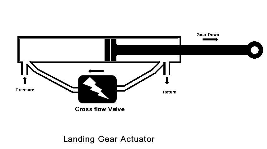 (landing Gear System Component) An automatic flow-control valve installed between the gear-up and gear-down lines of the landing gear of some large airplanes. When the landing gear is released from its uplocks, its weight causes it to fall faster than the hydraulic system can supply fluid to the gear-down side of the actuation cylinder. The crossflow valve opens and directs fluid from the gear-up side into the gear-down side. This allows the gear to move down with a smooth motion.