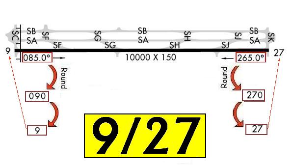 شماره گذاری باند فرودگاه که بر اساس زاویه باند نسبت به شمال مغناطیسی در جهت عقربه های ساعت شماره گذاری می گردد.دو طرف باند دارای دو عدد متفاوت است که هر دو بر اساس همان معیار زاویه نسبت به شمال مغناطیسی شماره گذاری شده و این دو عدد 180 درجه باهم اختلاف دارند. مثلا اگر یکسر باند 270 باشد طرف دیگر 90 است سپس صفر سمت راست برداشته شده و باند یاد شده به نام 27 و 9 شناخته میشود و برای نشان دادن آن روی نقشه ابتدا عدد کوچکتر در سمت چپ نوشته شده و عدد بزرگتر سمت راست.