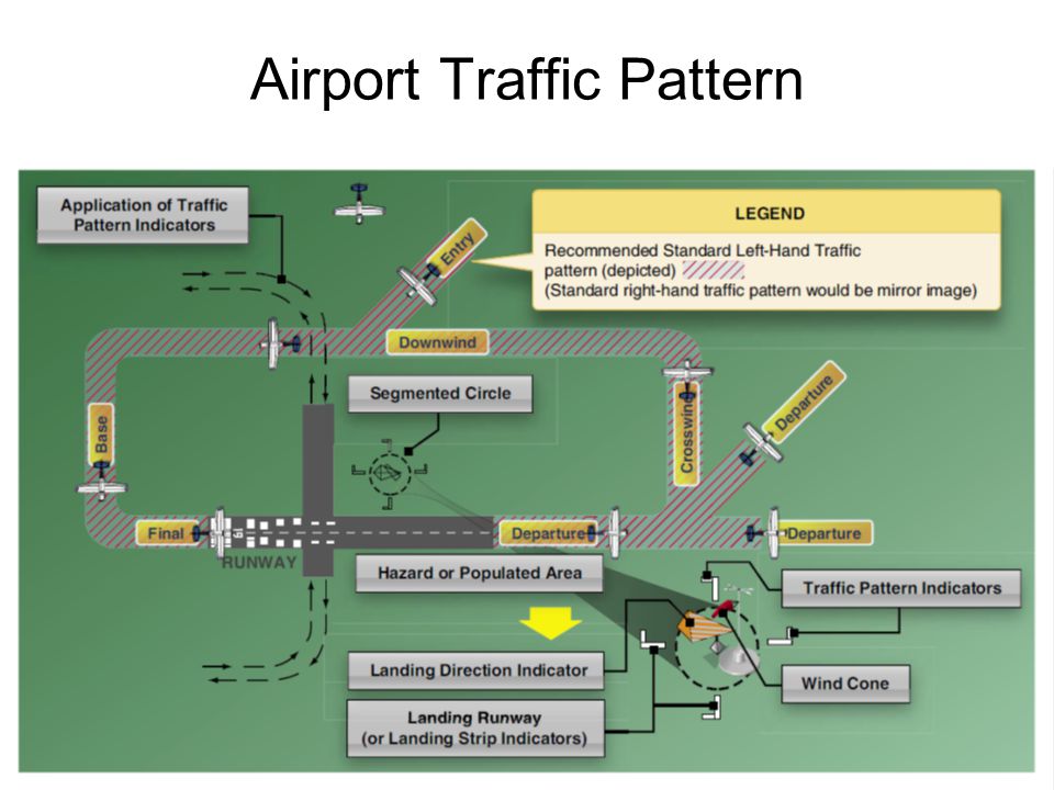 The traffic flow that is prescribed for aircraft landing at, taxiing on, or taking off from an airport. The components of a typical traffic pattern are: upwind leg, crosswind leg, downwind leg, base leg, and final approach.