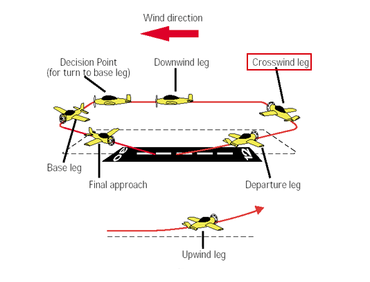 مسیر پرواز در زمان تقرب و فرود ، بعد از مرحله Upwind leg که هواپیما با یک چرخش نود درجه بصورت عمود بر راستای باند فرودگاه حرکت میکند. اصطلاحا در این مرحله هواپیما از سمت راست باد جانبی دارد.