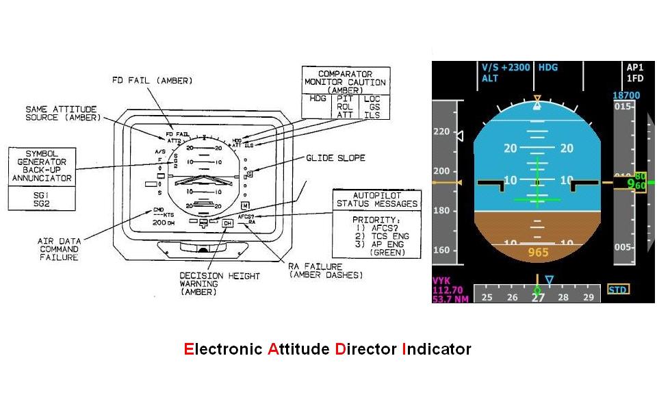 A colored multifunction display flight instrument that shows pitch and roll attitude indications along with flight director commands, localizer and glide slope indications, selected airspeed, ground speed, automatic flight control system and autothrottle modes, and radio altitude and decision height. An EADI is used in conjunction with an EHSI. See EHSI.
