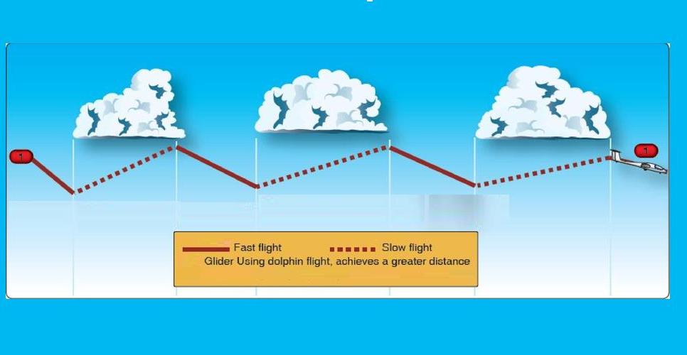 پرواز گلایدر که شبیه به حرکت دلفین است ،این شیوه پرواز در پرواز دور ( cross-country) با گلایدر مرسوم است. در شرایط جوی مناسب که ابر های کمولوس به صورت ردیفی یکی پشت دیگری تشکیل شده که اصطلاحاً به آن ( street of clouds ) یا خیابانی از ابرها را تشکیل میدهند. دراین صورت از جريانات بالا رونده (Thermal) زیر ابر با سرعت کم استفاده کرده و ارتفاع مناسب گرفته و با سرعت زیاد بسمت زیر ابر بعدی میرود این عمل را همچنان تکرار کرده تا به مقصد برسد.