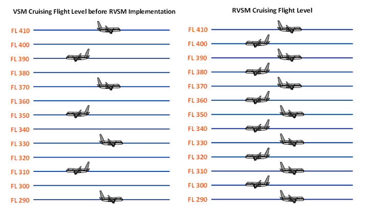 کاهش حداقل فضای عمودی ما بین هواپیماهای در حال پرواز از 2000 پا (فوت) به 1000 پا در ارتفاع پروازی بالای 29000 پا تا 41000 پا . RVSM برای افزایش کانال های پروازی و بهینه سازی مصرف سوخت تعریف شده است .