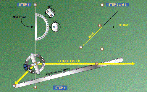 Navigation using calculations based on airspeed, course, heading, wind direction and speed, ground speed, and time Example: In the early stages of practical navigation, the student pilot navigates by using dead reckoning.